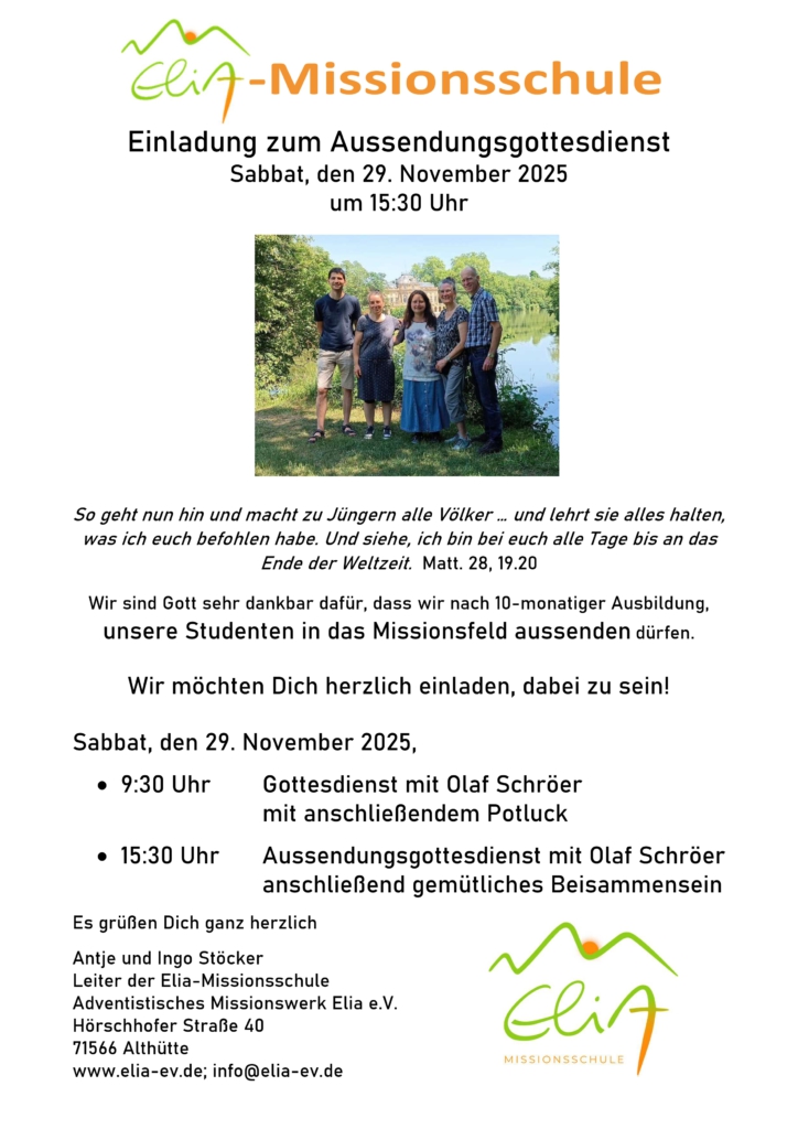 Herzliche Einladung zum Aussendungsgottesdienst am Sabbat den 29.11.25 um 15.30 Uhr Kategorie: Veranstaltungen Einladung_Aussendungsgottesdienst_2025Herunterladen Tags: Aussendungsgottesdienst Elia-Missionsschule Olaf Schröer 0Likes