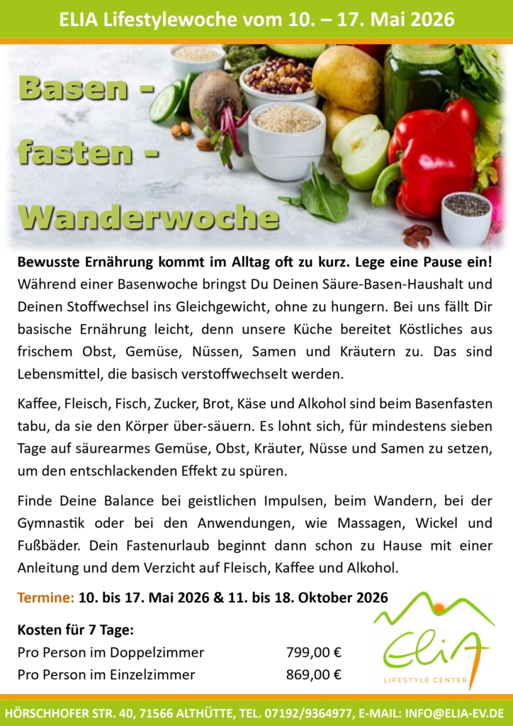 Lifestylewoche: „Basen-fasten-Wanderwoche“ vom 10. bis 17. Mai Kategorie: Veranstaltungen Lifestylewoche Basen-fasten-Wanderwoche 10.-17.5.26Herunterladen Tags: Balance Basen Basenfasten basische Ernährung Bewusste Ernährung Effekt entschlacken Fasten Fastenurlaub Gleichgewicht Natur Säure-Basen-Haushalt säurearmes Stoffwechsel Verzicht Alkohol Verzicht Fleisch Verzicht Kaffe Verzicht Käse Wanderwoche 0Likes