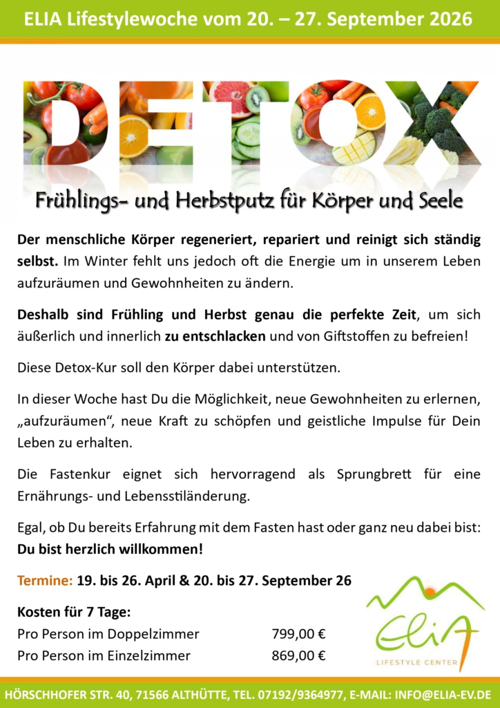Lifestylewoche: „Detox“ Herbstputz für Körper und Seele vom 20. – 27. September 2026 Kategorie: Veranstaltungen Lifestylewoche Detox 20.-27.9.26Herunterladen Tags: aufräumen Detox Energie entschlacken Ernährungsänderung Fastenkur Gewohnheiten Giftstoffe Herbstputz für Körper und Seele Impulse Körper Kraft schöpfen Lebensstiländerung regeneriert reinigt 0Likes