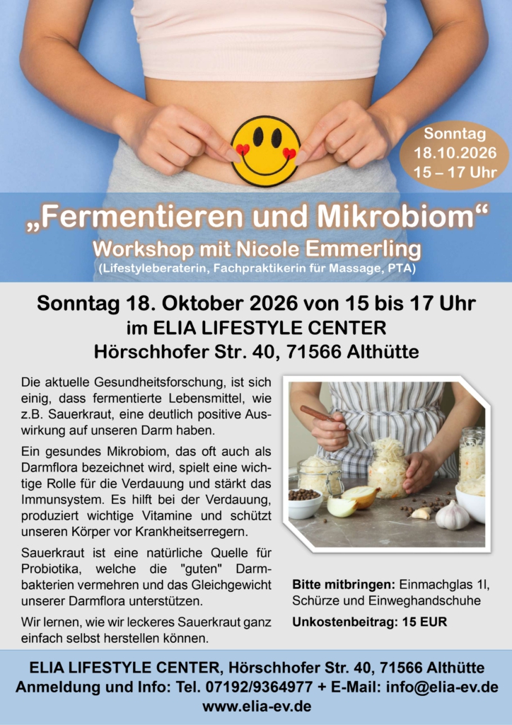 Workshop: „Fermentieren und Mikrobiom“ am 18.10.2026 von 15 – 17 Uhr mit Nicole Emmerling Kategorie: Veranstaltungen Flyer Workshop Fermentieren und Mikrobiom 18.10.26 N. EmmerlingHerunterladen Tags: Darm Darmflora Fermentieren Gleichgewicht Immunsystem Krankheitserreger Mikrobiom Probiotika Sauerkraut schützt Verdauung Vitamine Workshop 0Likes