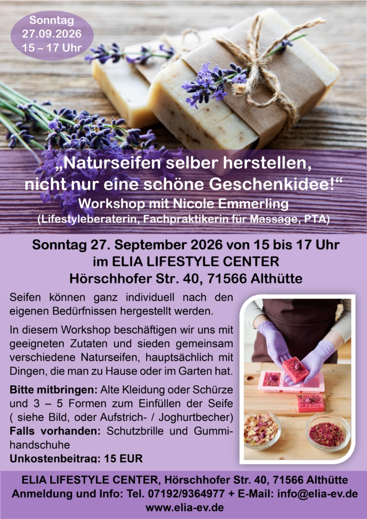 Workshop: „Naturseifen selber herstellen, nicht nur eine schöne Geschenkidee!“ am 27.09.26 von 15 bis 17 Uhr mit Nicole Emmerling Kategorie: Veranstaltungen Flyer Naturseifen-Workshop am 27.09.26Herunterladen Tags: eigenen Bedürfnissen individuell Naturseifen Seifen selbst herstellen Workshop 0Likes